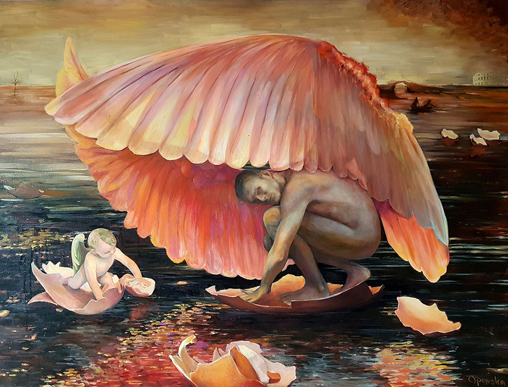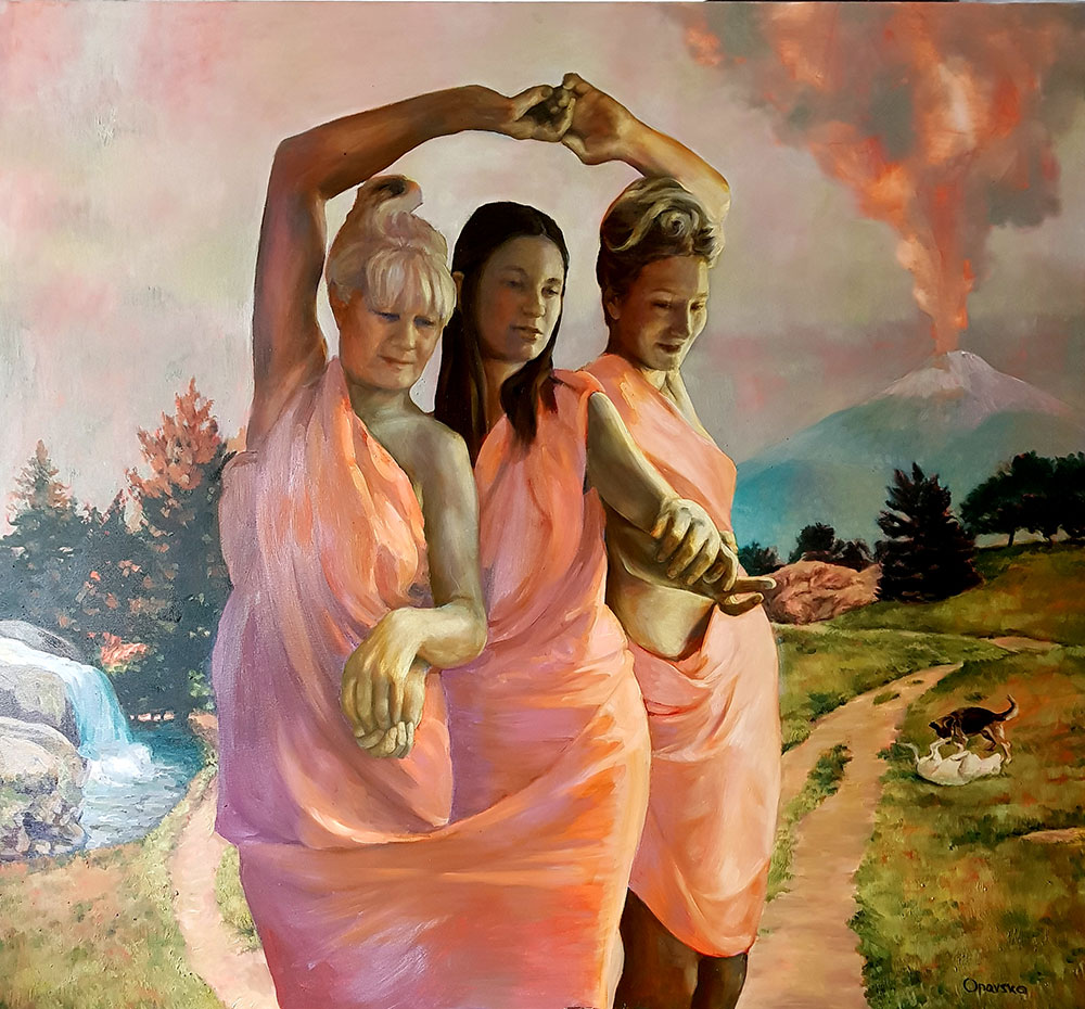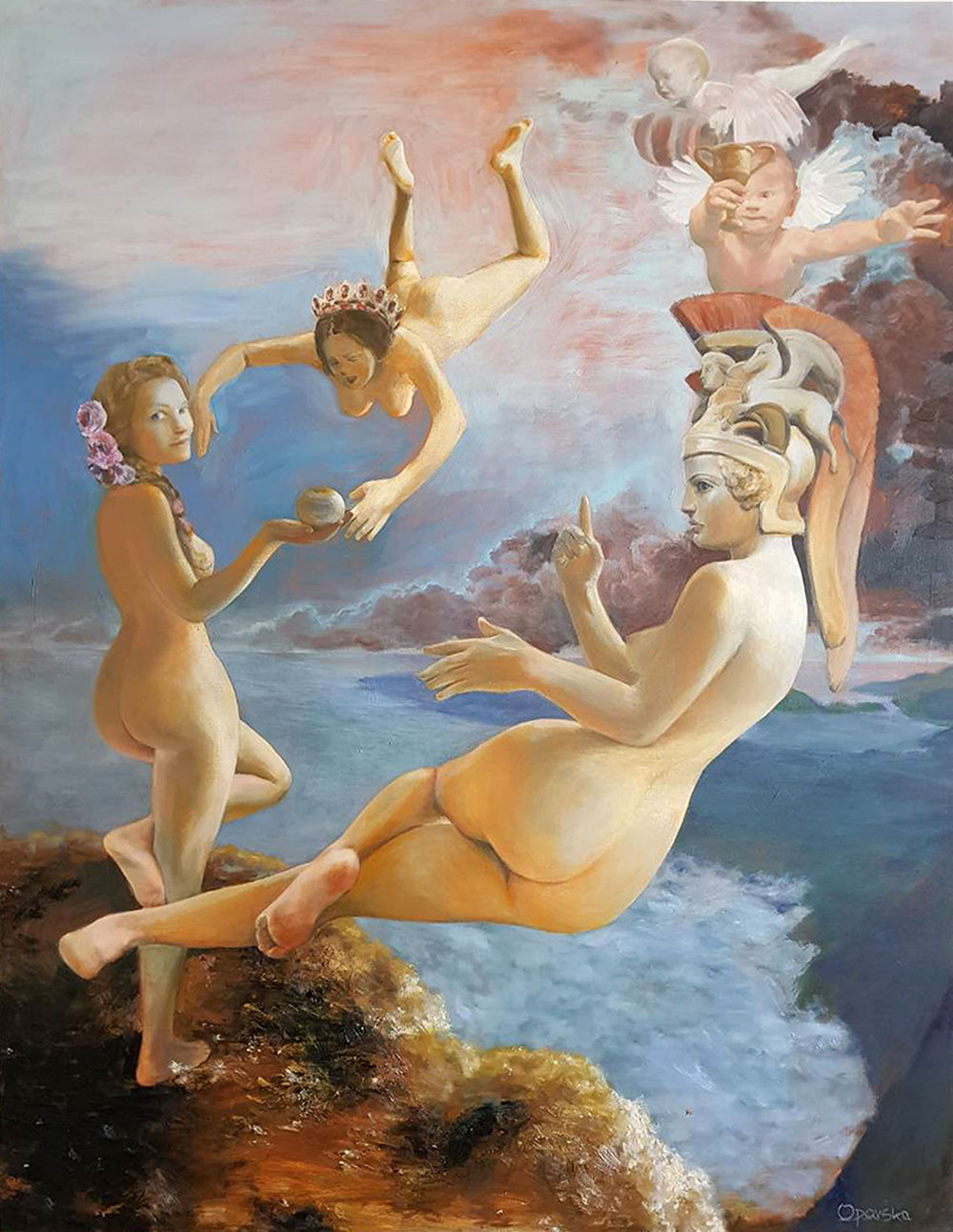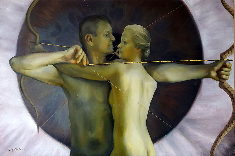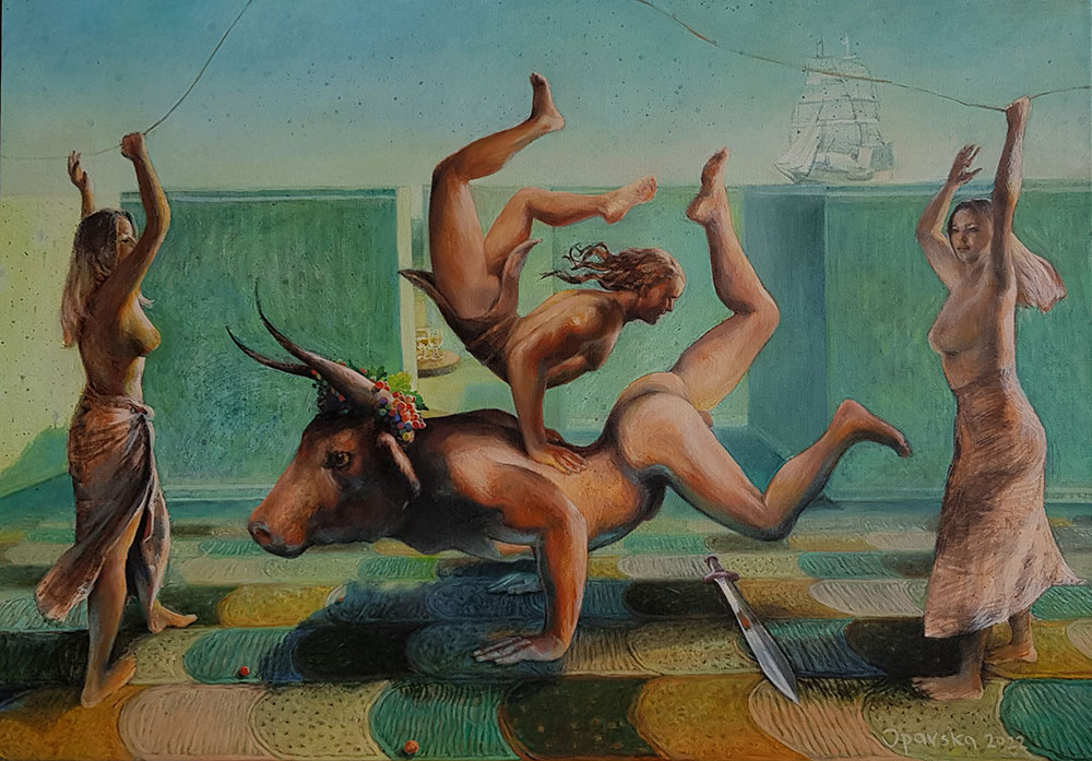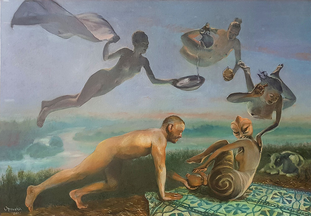 Umetnica Jasna Opavski (1974) svoj rad nije ograničila samo na četkice i boje – osim slikanjem, ona se bavi i pisanjem te performansom kojim pokušava da povrati sećanja na mitološka bića koja je inspirišu. Prikazi nagih tela kroz njenu interpretaciju pozivaju posmatračan dijalog i razmenjivanje ličnih fantazija.