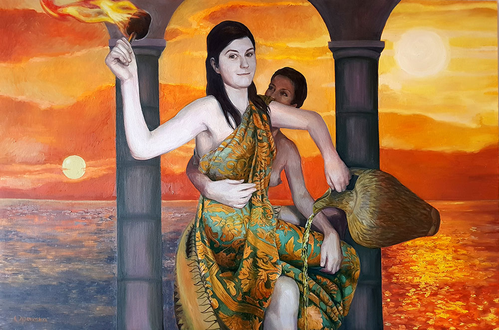 Puno mitova volim, ali izdvojiću ovoga puta mit o Demetri i Persefoni na kom su počivale Eleusinske misterije, najveći kult stare Grčke. U te misterije su bili inicirani svi slobodni Grci, uključujući svima nama poznate filozofe, i mnogi znameniti Rimljani kao što je Ciceron, sve dok kult nije ugašen u četvrtom veku od strane hrišćanske crkve. Mit govori o velikoj majci, boginji plodnosti Demetri, čiju je ćerku oteo bog podzemlja. Od majčine tuge je sve prestalo da rađa, pa je na Olimpu doneta odluka da Persefona, provodi dve trećine godine sa majkom na sunčevoj svetlosti, a jednu trećinu pod zemljom sa mužem. To je slika jesenje setve, počivanja semena pod zemljom tokom zime i radosnog bujanja na proleće, koje simbolizuje vaskrsenje. Malo je poznato, da biblijski citat koji je Dostojevski odabrao za moto Braće Karamazovih, u stvari ima svoj nagoveštaj u Demetrinom kultu: „Ako zrno pšenice padnuvši na zemlju ne umre onda jedno ostane, ali ako umre mnogo roda rodi.“ Moglo bi se mnogo o ovome pričati. To je velika tajna žrtve, koja u Hristu ima svoju kulminaciju. Do sada sam više puta slikala mistični odnos majke i ćerke, a sada planiram da započnem novi ciklus slika koji će povezati ovu priču s Ocem i Sinom.